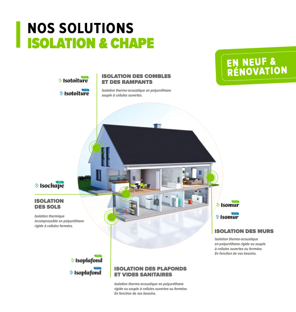 L’application de la mousse polyuréthane projetée permet d’isoler les sols, les murs, les combles et les toitures, adaptée aux habitations, aux bâtiments industriels et agricoles. En raison de sa faible conductivité thermique, elle nécessite des épaisseurs moins importantes que les isolants traditionnels.